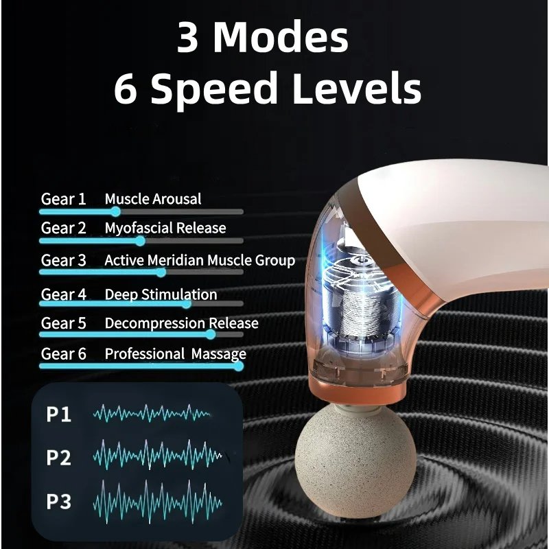 3 أوضاع و6 مستويات سرعة: قم بتخصيص مسدس التدليك الخاص بك باستخدام 3 أوضاع و6 مستويات سرعة (1200-3000 دورة في الدقيقة). يمكنك اختيار الوضع والسرعة المناسبة وفقًا لتفضيلاتك. يحتوي الوضع 1 على 6 إعدادات سرعة قابلة للتعديل. الوضع 2 (3200 دورة في الدقيقة) والوضع 3 (3600 دورة في الدقيقة) لديهما إعداد سرعة ثابتة. الوضع 1، يمكنك ضبط السرعة بالضغط على الزر، ويمكنك أيضًا التسريع عن طريق زيادة الضغط بين جهاز التدليك وعضلاتك.